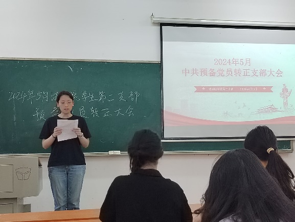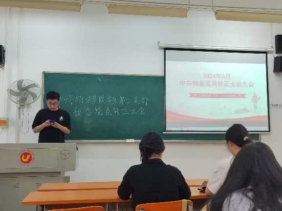 首先,由申请转正的李对对等七名预备党员依次向支部汇报个人情况,其余党员认真听取报告内容并做好记录。发表完毕后,组织委员王思龙同志先发表综合审查意见并交由二支部正式党员同志进行举手表决,表决结果为一致通过七名预备党员的转正申请。