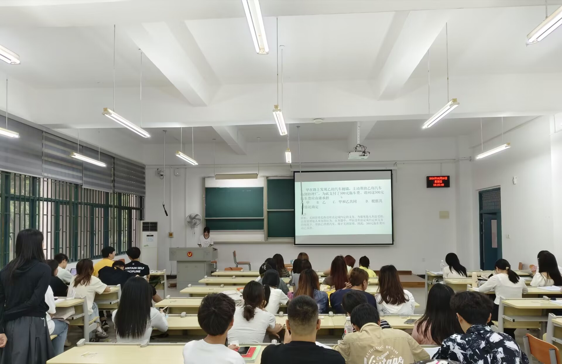 每次由5位同学负责,讲授上一周所学内容,探讨相关考试真题,结合实际案例运用等。同学们认真准备资料,搜索、分析典型案例,积极分享讨论。不仅锻炼了法学思维,还提高表达水平,为后续通过法考、考研、考公的笔试和面试环节打下基础。