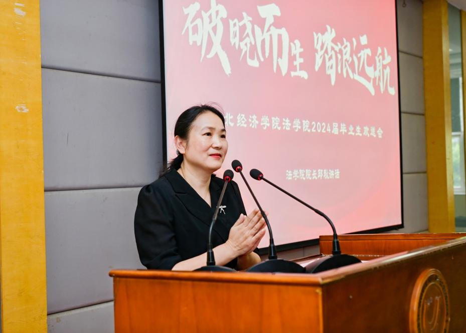 2024届毕业生代表刘鑫源、侯天雨感恩老师的悉心栽培,表达了对未来的美好祝愿。班主任代表罗文君老师表达了对毕业生的不舍与殷殷期盼,她对毕业生们提出两点建议,一是接受自己的有限性、面对世界的多样性,二是找到自己、拥抱自我,在新的征程中,坚守法律人的初心和使命,在人生舞台上绽放光彩。