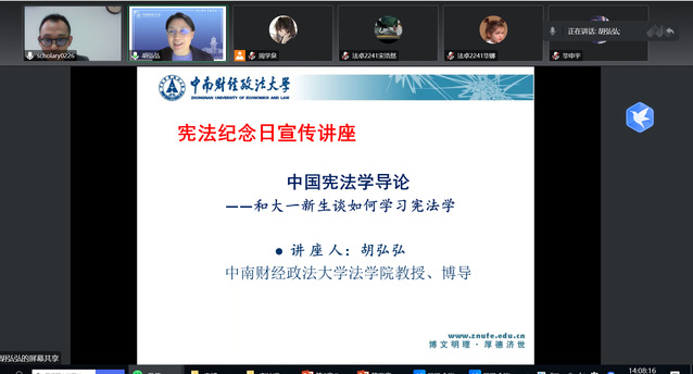 本网讯(通讯员 崔雨晴)2022年11月28日下午两点,中南财经政法大学球速体育教授、湖北省人大常委会委员、湖北省法学会宪法学会副会长胡弘弘教授应邀为公司大一新生讲学,围绕“中国宪法学导论”为球速体育2022级员工开展宪法纪念日宣传讲座,与大一新生谈如何学习宪法学,宪法学与行政法学PI团队负责人王秀才博士参加本次讲座。