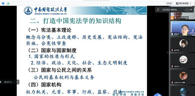 胡教授全程为员工进行如何学习宪法学的讲解,抛出理论与实践相结合的问题,引导员工们深入思考,开拓员工的学术视野,帮助员工解决学习宪法学的困惑。同学们也积极参与讲座,在公屏上与胡教授进行互动。虽然,此次讲座在线上举行,没有老师与员工面对面的线下交流,但胡教授的耐心讲解与同学们的积极回答互动,为这场宪法宣传讲座画下了圆满的句号。