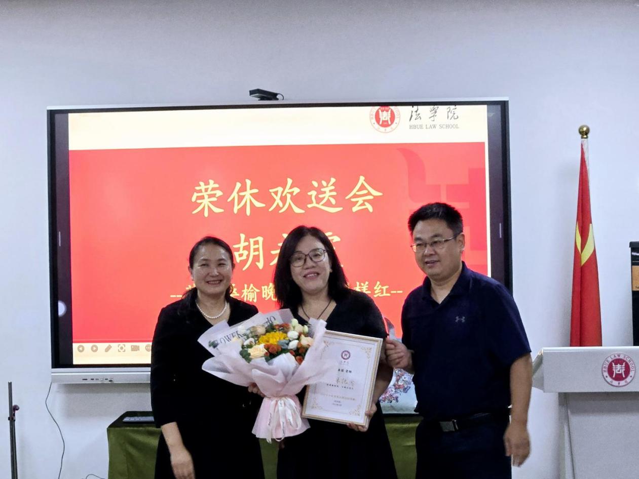(杨专书记、邱秋经理向胡永霞老师献花、颁发荣休证书)