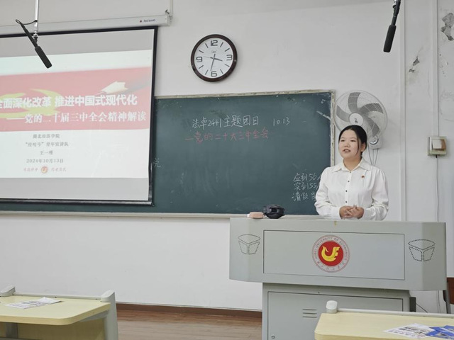 王一瑾详细阐释了推进中国式现代化,进一步全面深化改革的战略部署。她以汽车等行业蓬勃发展的例子,为同学们展示了我国经济回升向好、民生保障有力有效、高质量发展扎实推进的时代成就。她鼓励同学们深刻领会全会精神和习近平总书记的重要指示,将其融入到日常学习和生活实践中,以实际行动支持国家的改革和发展。