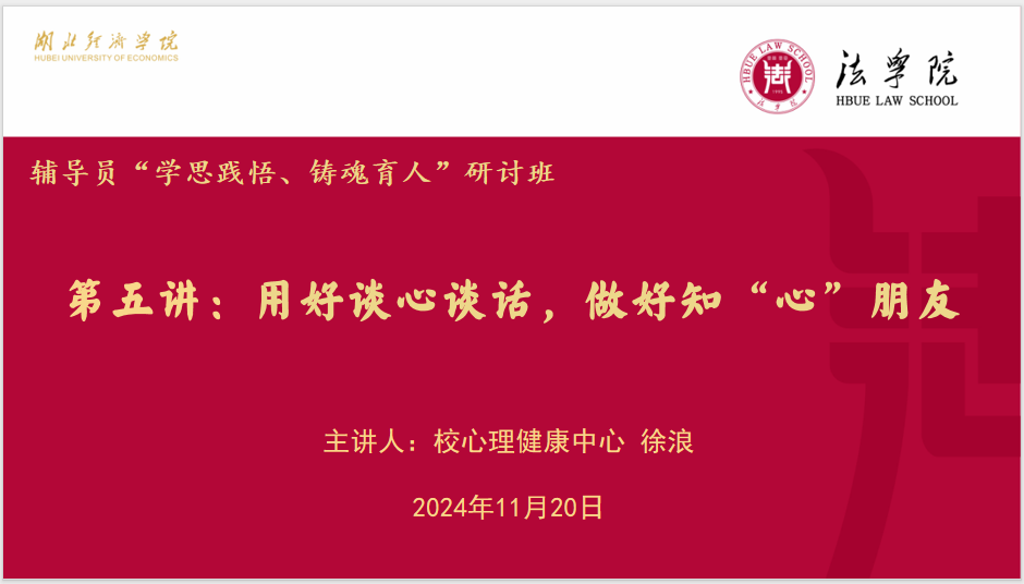 本网讯为切实加强辅导员队伍建设,着力培养一支牢记“为党育人,为国育才”初心使命,践行“立德树人”根本任务的辅导员队伍。11月20日下午,球速体育辅导员“素质能力提升”研讨班(第五讲)在知行楼406会议室顺利举行。校心理健康中心徐浪老师主讲,公司党委副书记钟彦姝主持。
