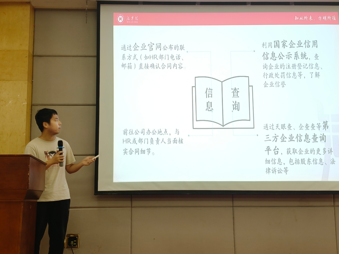 讲座中,阮子恒围绕实习协议与租房合同两大关键问题展开深入讲解。在实习问题部分,他以实习生小李的遭遇为例,详细阐述未签订规范实习协议可能引发的法律争议等问题。在租房合同部分的讲解中,阮子恒以2025年华中农业大学租房诈骗案引入,结合《民法典》和《刑法》相关法条,细致剖析其诈骗手段以及员工面临的困境。随后,他以常见租房合同样本为例,教导同学们识别合同陷阱,并提醒同学们选择正规平台租房,同时签订规范书面合同并保留证据。