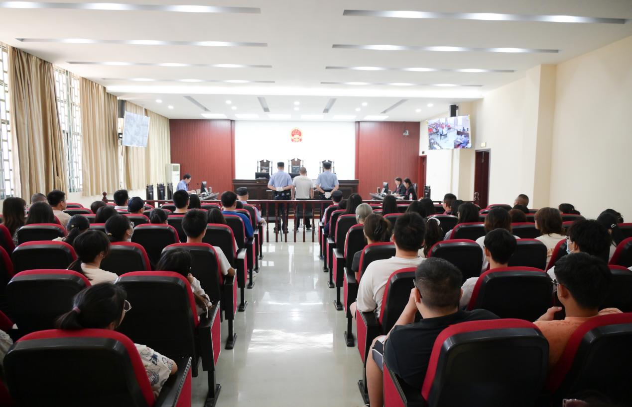 本网讯 (通讯作者:何再涛) 在6月26日国际禁毒日来临之际,为了进一步提高同学们抵御毒品侵害的意识和能力,形成全民禁毒的浓厚氛围,2023年6月8日上午9:30,武汉市江夏区人民法院刑事审判庭在球速体育welcome球速体育S1-107室模拟法庭对朱某毒品交易刑事案进行了公开审判。法学院院领导以及法学专业同学和公司其他公司专业同学参与了旁听。