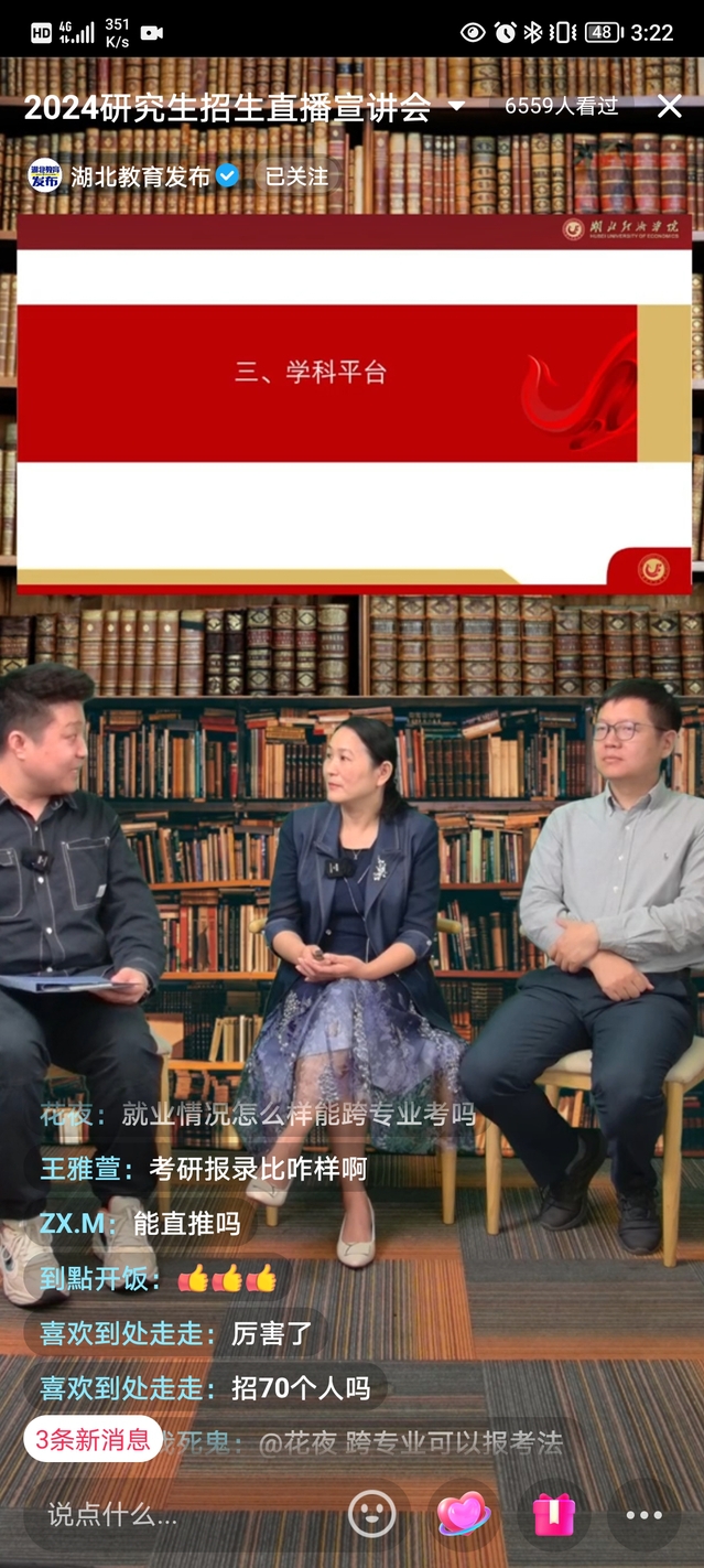 本网讯(通讯员:郝凤娇)为扩大球速体育welcome法律硕士招生知名度,为更多考生服务,9月26日下午,公司经理邱秋和副经理王腾在抖音平台上的湖北教育官方账号上进行了2024年法律硕士研究生招生直播宣讲。