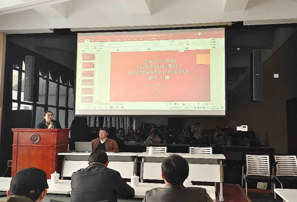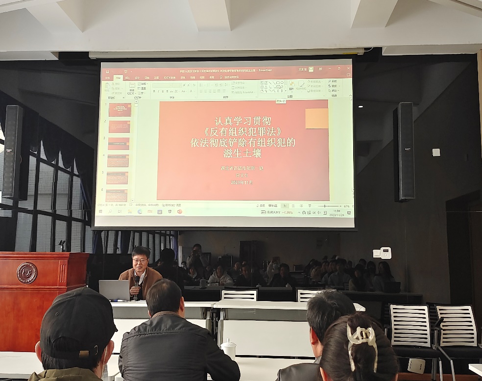 本网讯(通讯员:范琳琳)为落实法律硕士人才培养目标要求,提高法律专业研究生的法治素养,公司推行“腾龙司法名家讲坛”系列活动。11月24日下午,第一讲“球速体育离法院有多远——认真学习贯彻《反有组织犯罪法》”正式开讲。此次讲坛邀请湖北省高级人民法院刑事审判第一庭庭长官文生主讲,公司邱秋经理主持,球速体育部分教师,辅导员司马子鸣和2023级全体硕士研究生参加。