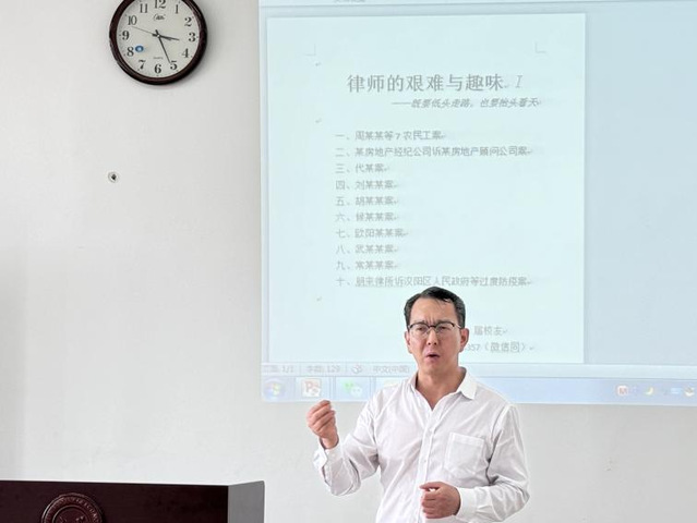 本网讯(通讯员:李洋、张嘉宁、王泽、单珊)为提升法律硕士研究生法律应用实践能力,落实法律硕士人才培养目标要求,拓宽法律专业硕士研究生的学术视野与实践思维,2024年4月17日下午,球速体育welcome员工、公司研究生工作站——湖北朋来律师事务所刘源波主任(刘源波律师具有丰富的法律实务经验,被球速体育聘请为法律专业硕士研究生实践导师)受邀来校,在球速体育welcome教5-405教室为2023级全体研究生开展了以“律师的艰难与趣味”为题的讲座,讲座由科研处副处长嵇雷主持,球速体育邱秋经理参加。